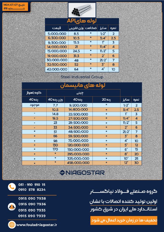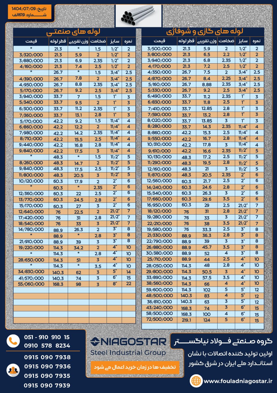 برای دریافت جدیدترین قیمت لوله و پروفیل با تلفن 09105788234 تماس بگیرید.