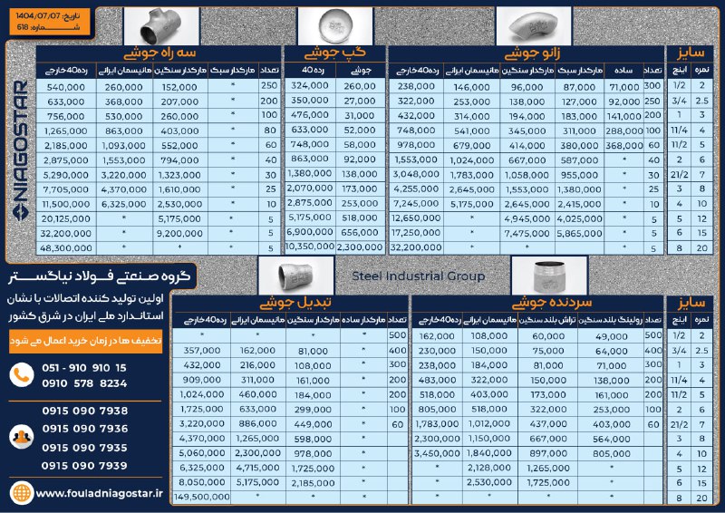 جدول قمیت اتصالات جوشی گازی "گروه صنعتی فولاد نیا گستر"